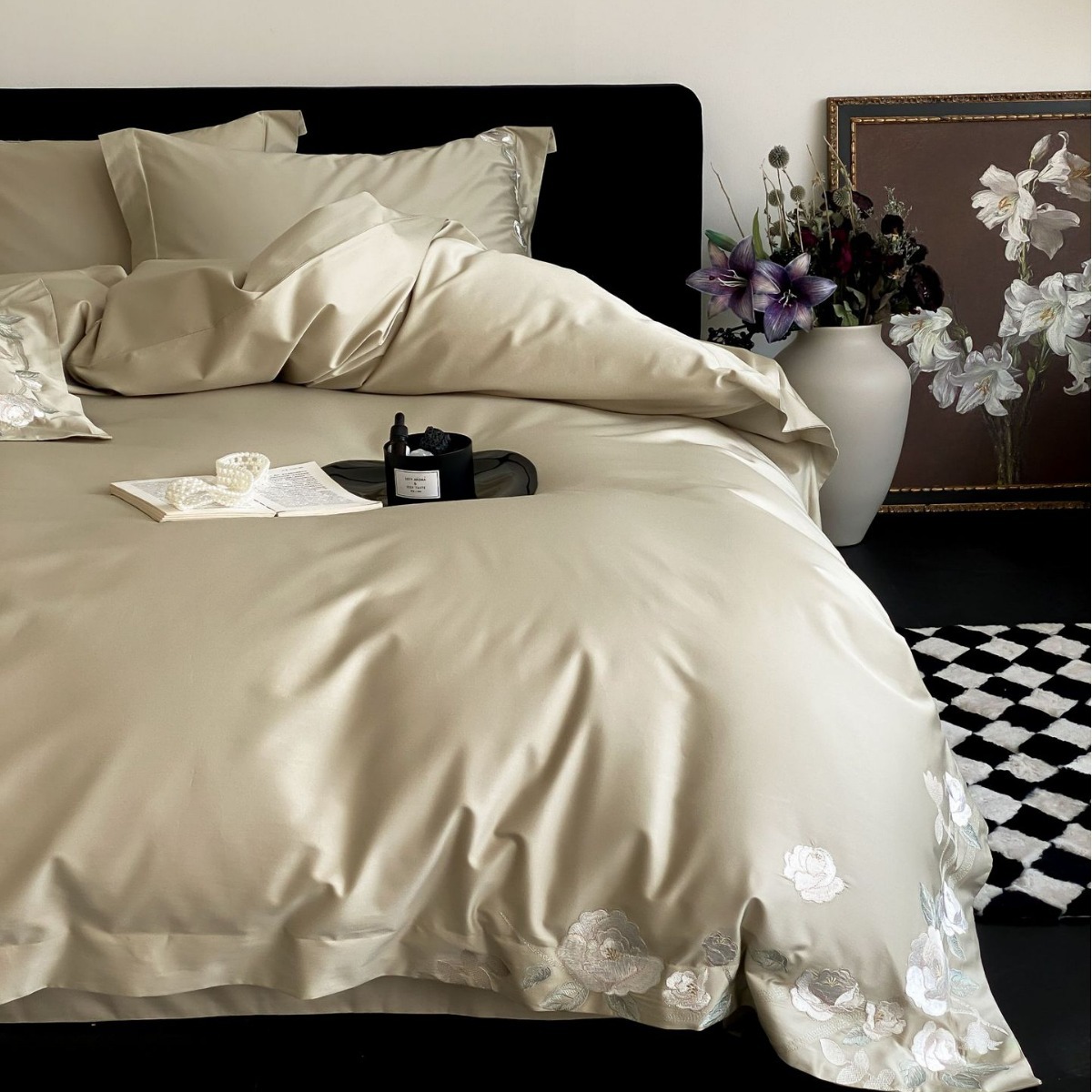 フレンチライトラグジュアリー長綿4点セット シンプル花柄刺繍ベッドシーツ 掛け布団カバー 純綿 ダブル1.8m寝具