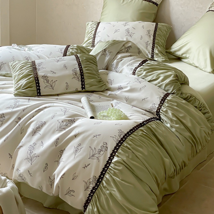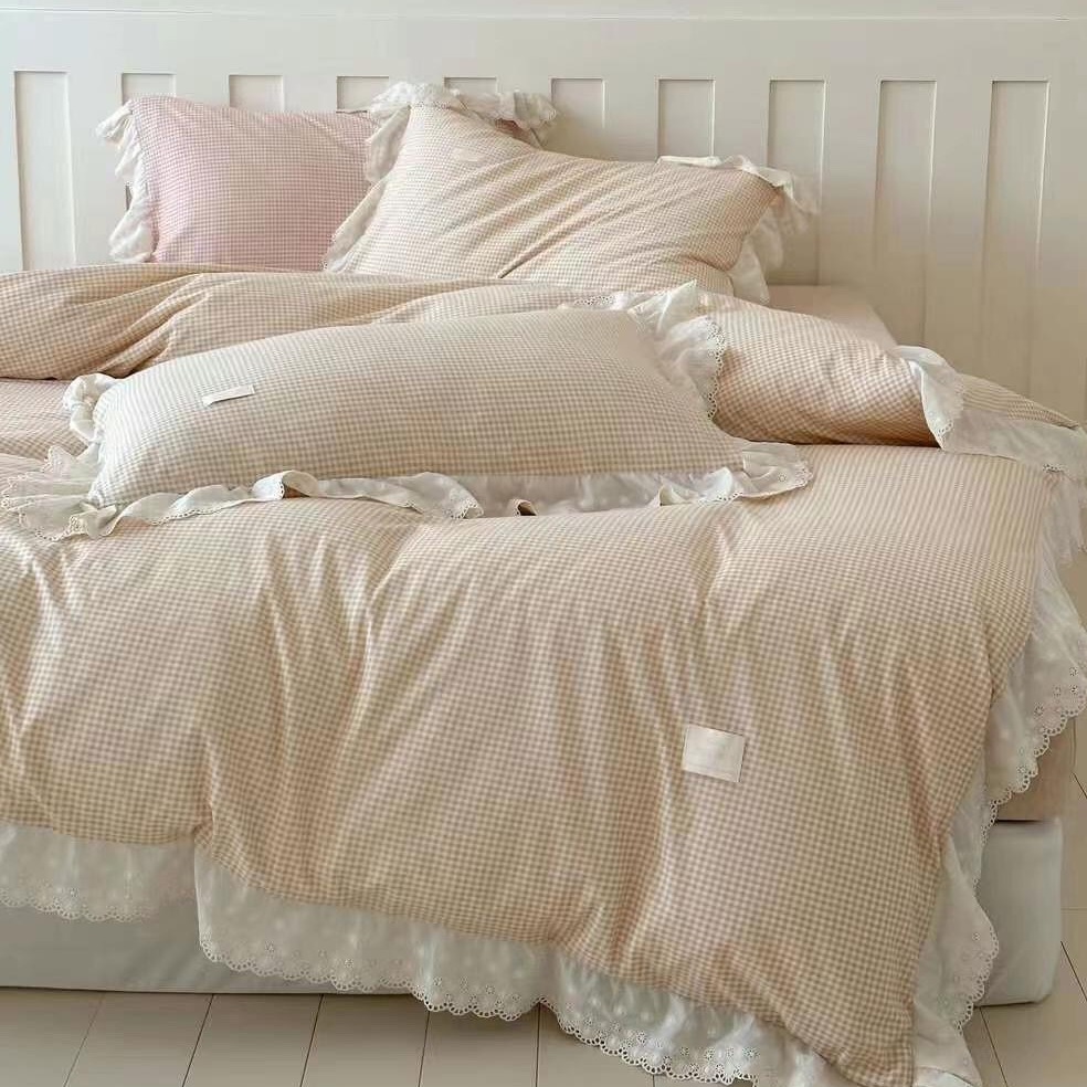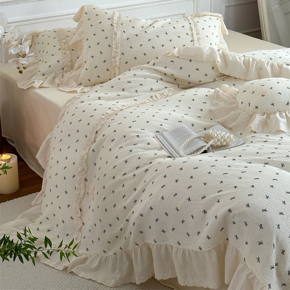 韓系ins風二重紗縮布四点セットのハスの葉の縁の砕花少女心純綿布団カバー寝具