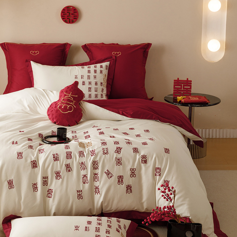 結婚祝いの純綿功サテンデジタルプリント刺繍四点セット純綿赤い結婚祝いの寝具