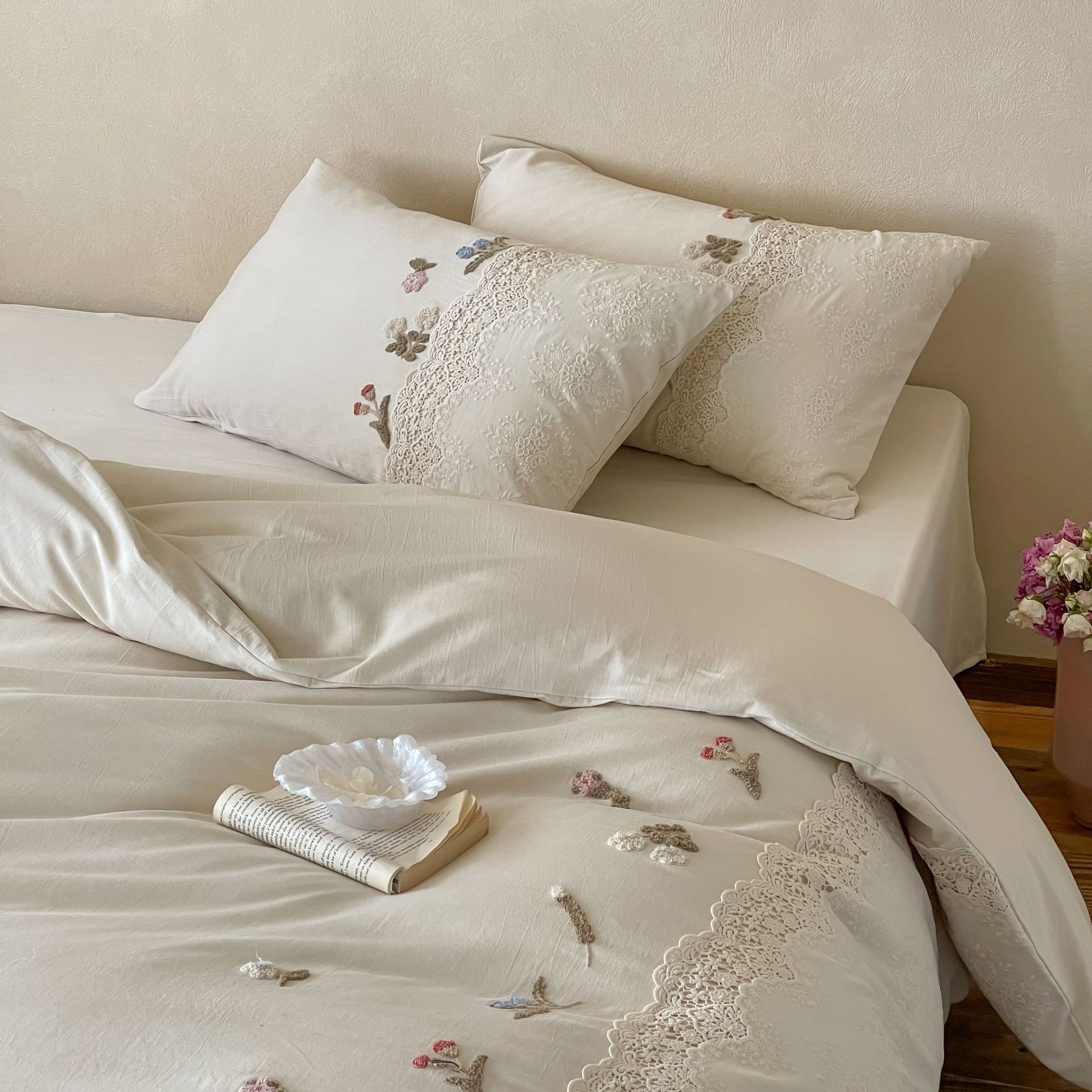 クラスA田園風花柄刺繍綿麻4点セット中空レースニッチ文学的で芸術的なライトカラーシーツ