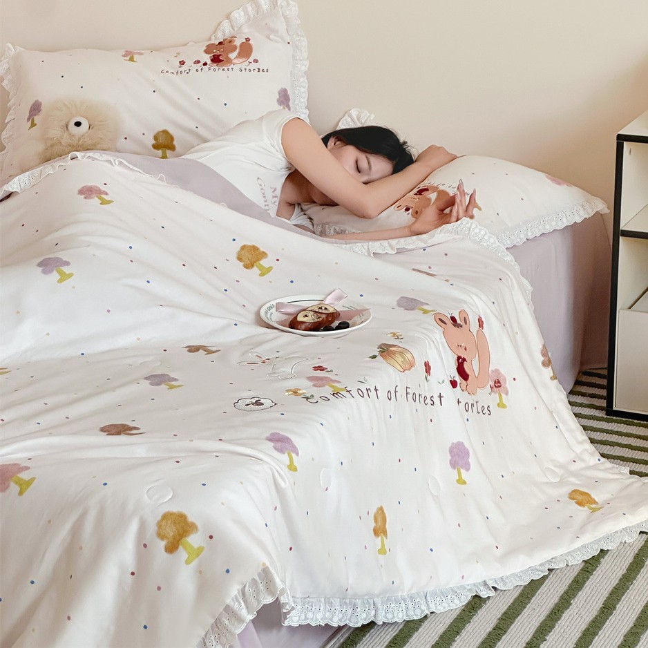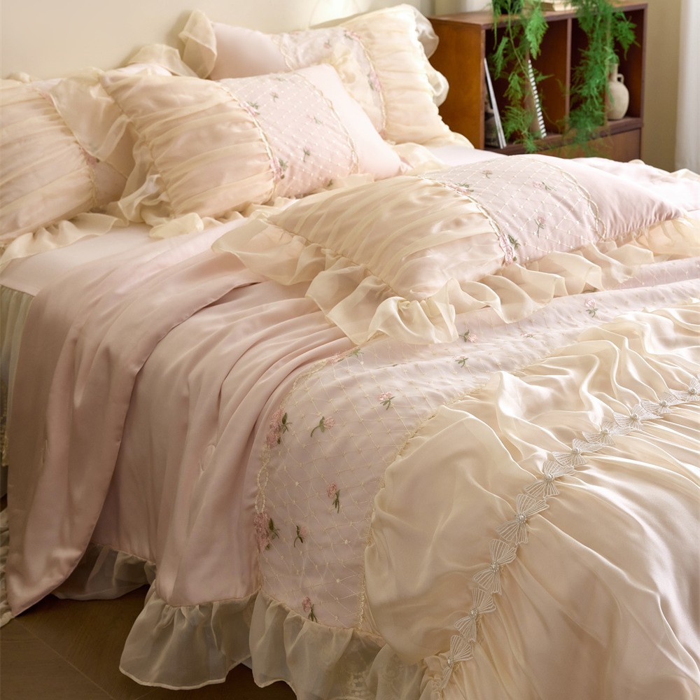 フレンチプリンセススタイル エンジェルス テンセル長繊維綿 サマーキルト 4点セット レース刺繍 ベッドスカート ベッドカバー 四季兼用寝具