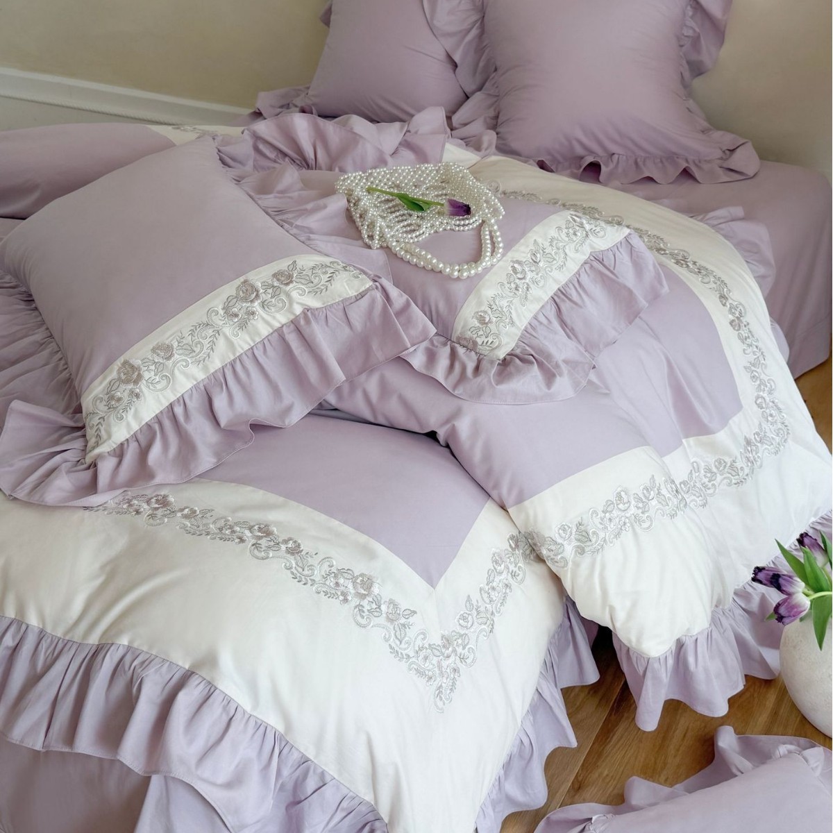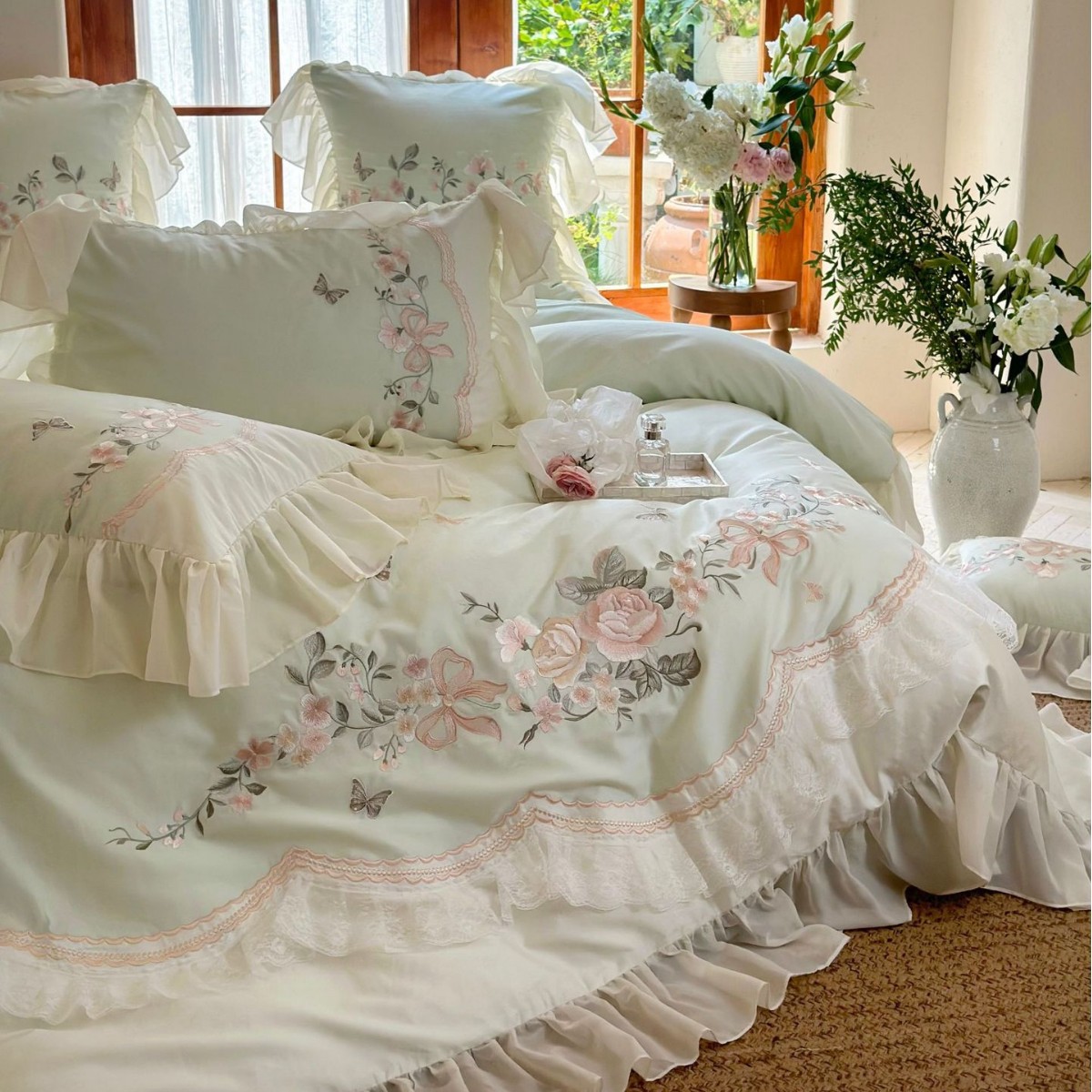 ライトラグジュアリーフェアリースタイル長繊維綿純綿4点セットロマンチックな花柄刺繍入りキルトカバーシーツ女の子寝具