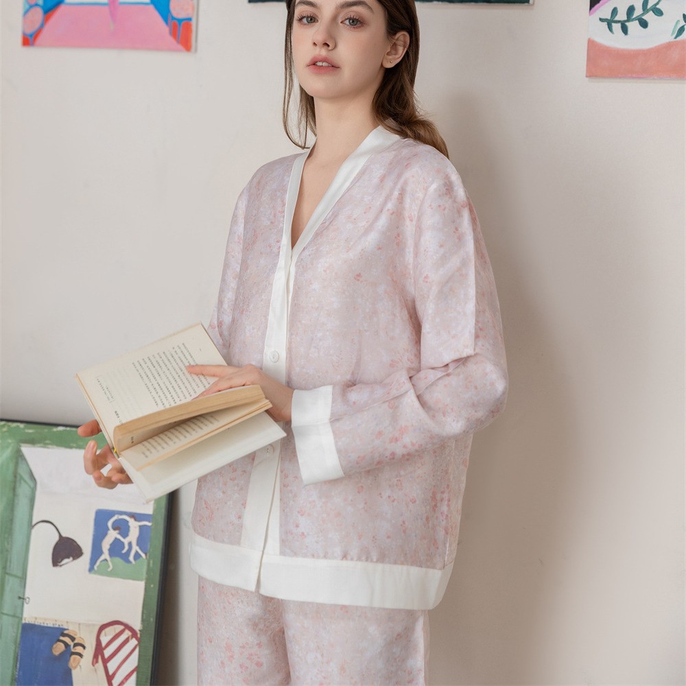 ファッショナブルな春の女性の V ネックパッチワークリヨセルテンセル長袖ズボンスーツカジュアルホームウェア女性のパジャマ