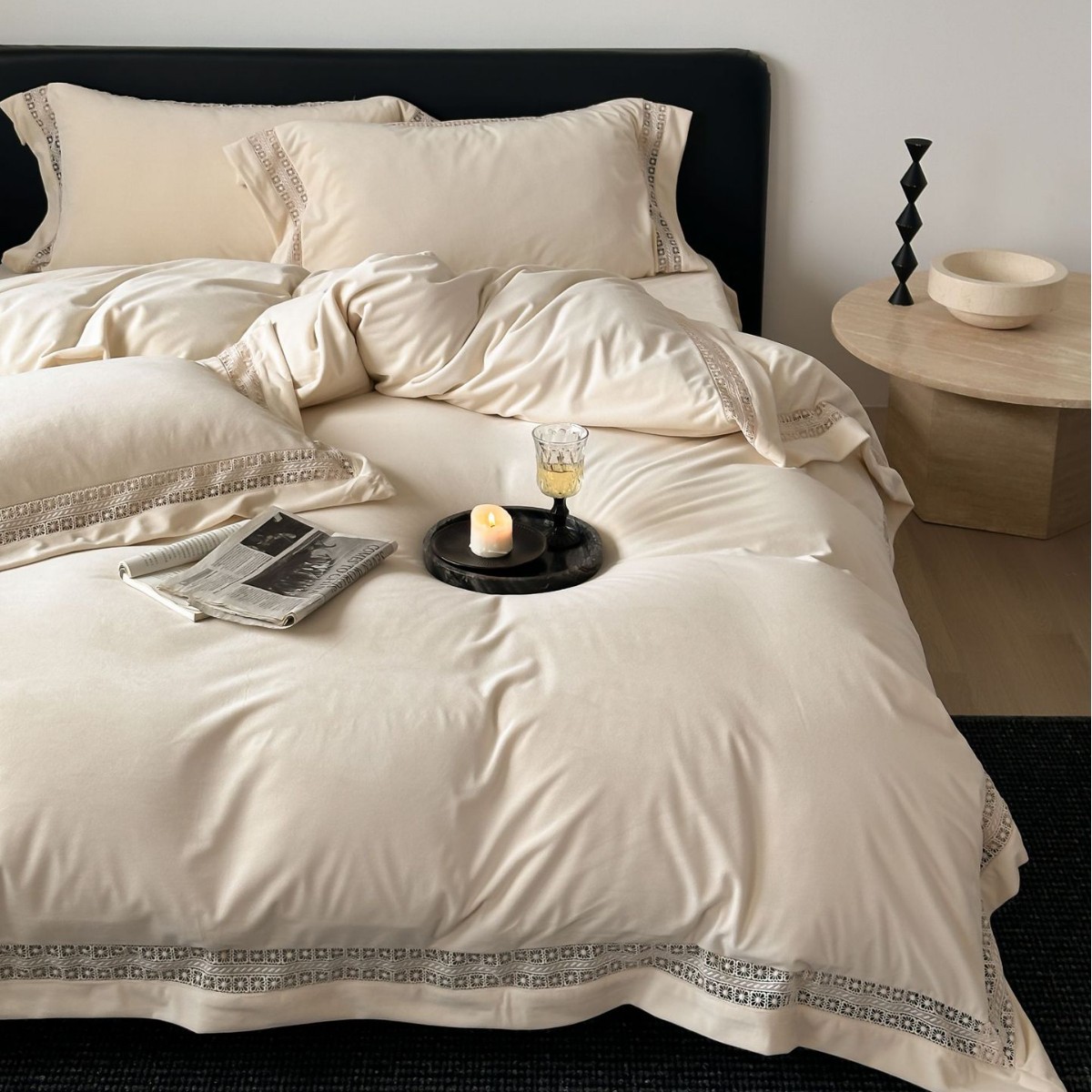 刺繍入り60番手ランジンテンセル4点セット、水玉模様、ガーリーな刺繍、涼感、裸で寝るのに最適、1.5mベッド用寝具セット、布団カバー