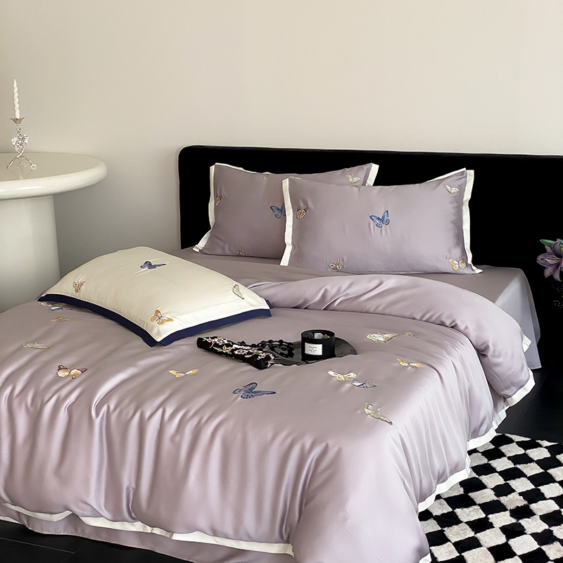 クラスA 60s レンチングテンセル 4点セット ガーリーハート 蝶刺繍 シルキーキルトカバー ベッドシーツ 1.8m 寝具