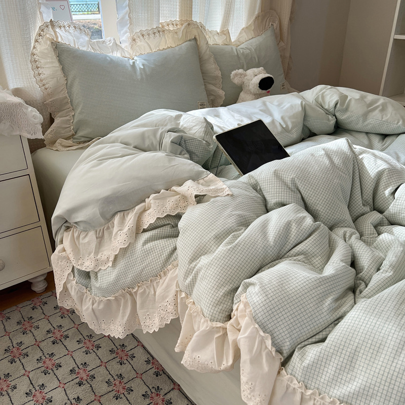 韓国風フレッシュコットン先染めウォッシュコットンベッド4点セットチェック柄レース純綿キルトカバーシーツ1.5m