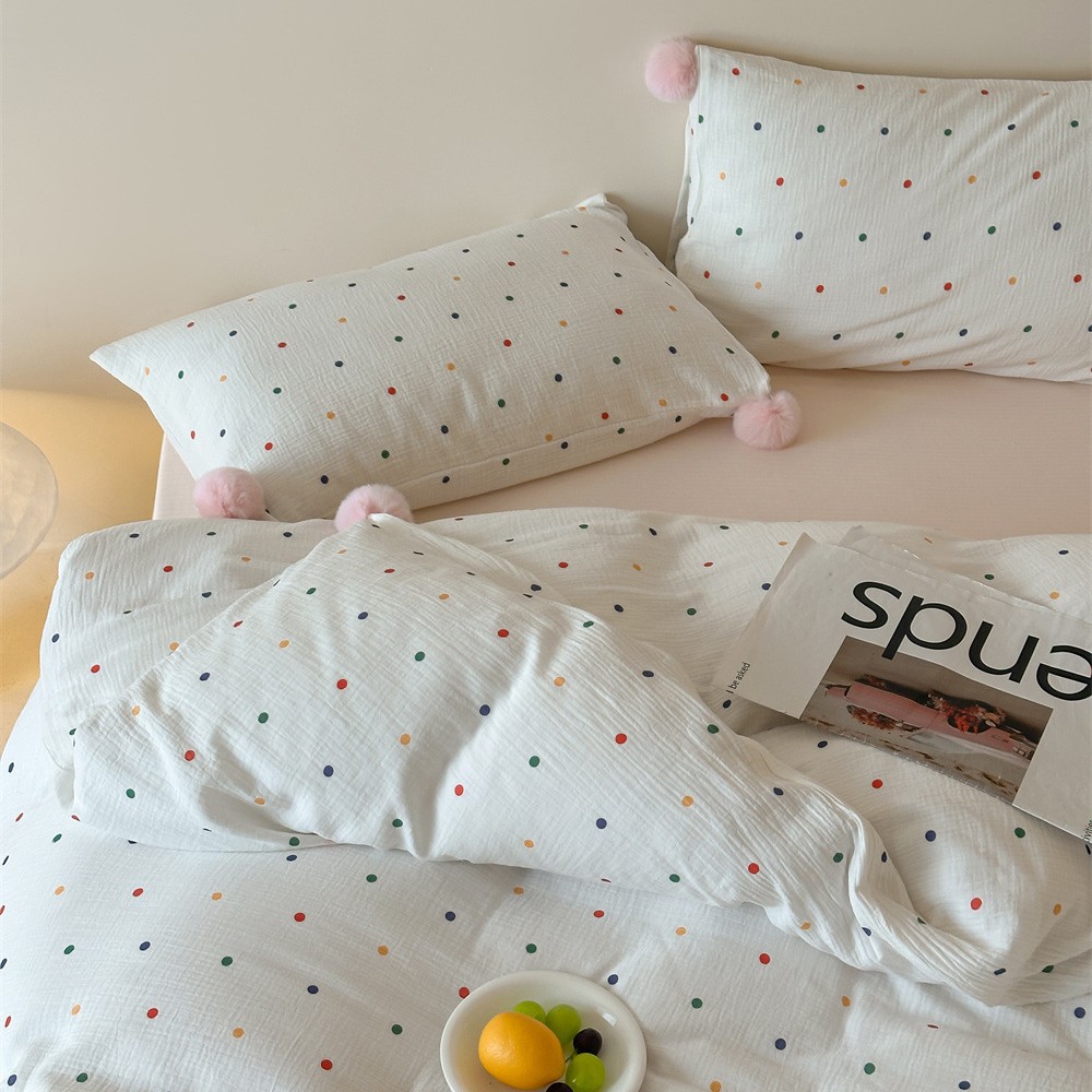 純綿タイプA カラフル水玉ガールハート 二層しわ糸 4点セット 純綿毛玉キルトカバー ベッドシーツとボックスシーツ