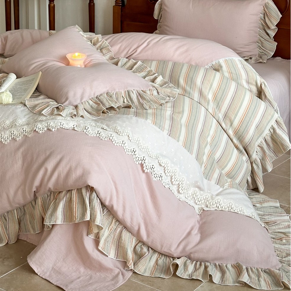 綿先染めウォッシュコットンシアサッカーレトロストライプ学生用掛け布団カバー4点セットガーリーハート単品ベッドシーツとボックスシーツ