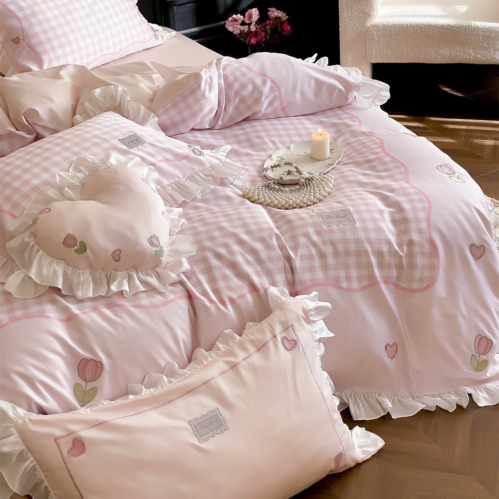 ガーリーハート スーパーソフト リヨセルコットン 4点セット ピンクチューリップ刺繍 フリルキルトカバー 1.8m 四季兼用寝具
