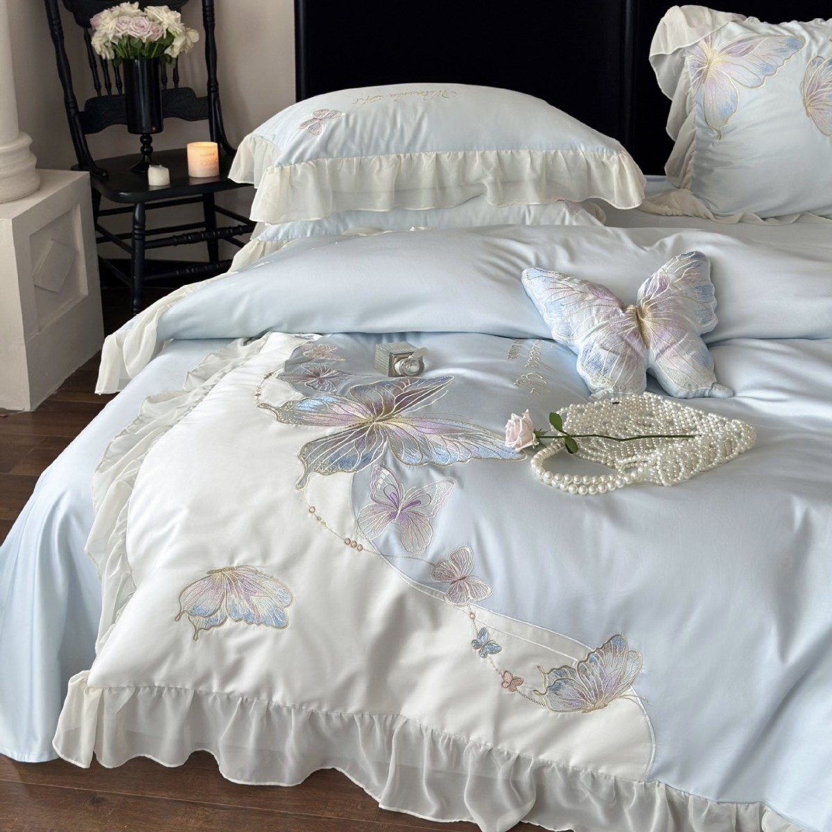 甘美な少女の心100sの長い綿の4セットの純綿のシフォンの蝶の刺繍の掛け布団カバーの四季の寝具