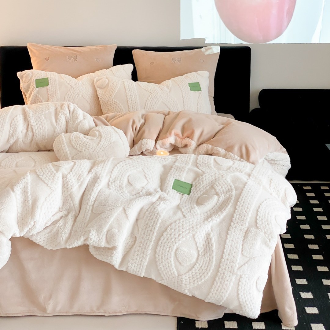 秋冬保温立体彫刻花舒綿毛の四つのセットの少女の心の両面の毛を厚くして、ミルクの毛を厚くして、ベッド用品をカバーします。