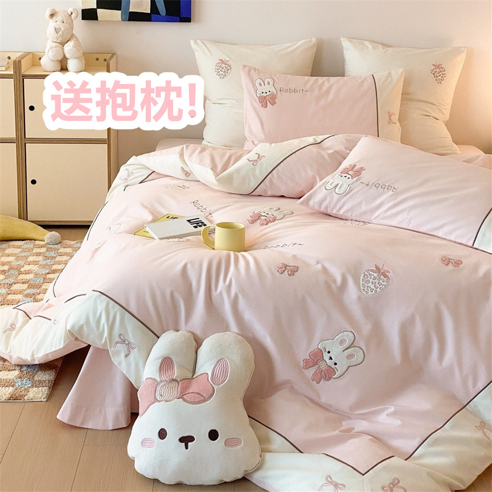秋冬のベルベットのウサギは100本の綿を厚くして毛を研ぐ4セットの刺繍少女の心の綿のシーツの布団カバーを作った