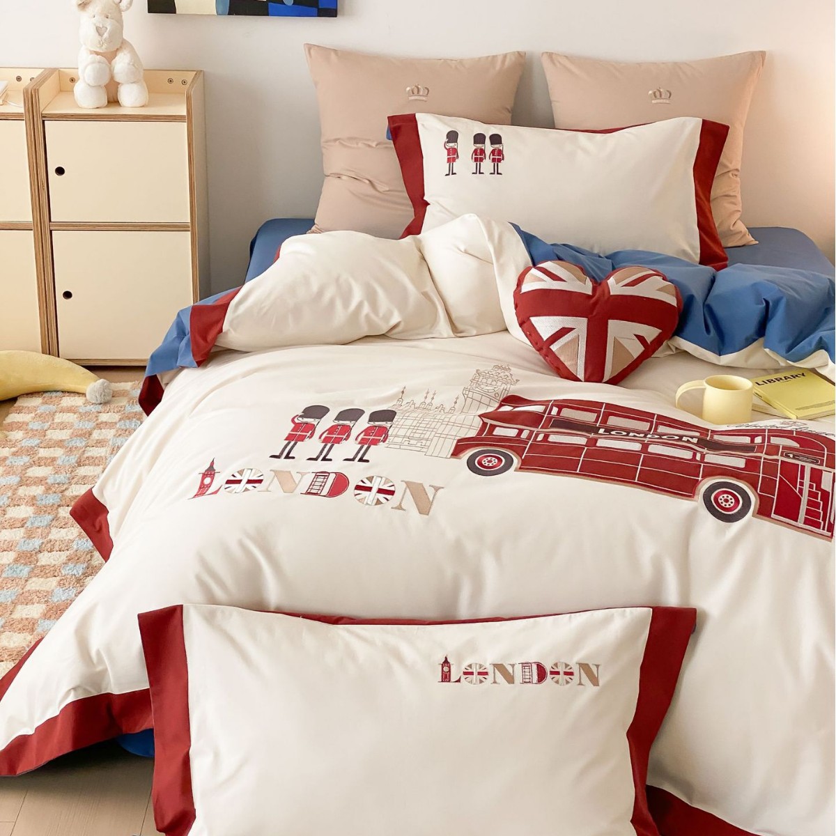 秋冬英倫風100本の綿綿超柔磨毛アニメ4点セットのかわいい刺繍が子供の趣味ベッド用品にセットされている