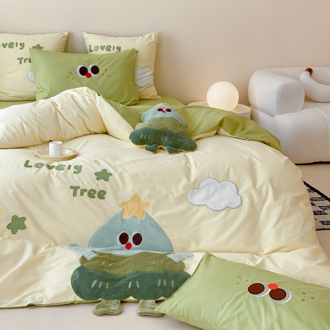 漫画清新二重糸四点セットかわいい小萌龍刺繍肌通気秋冬シーツ寝具