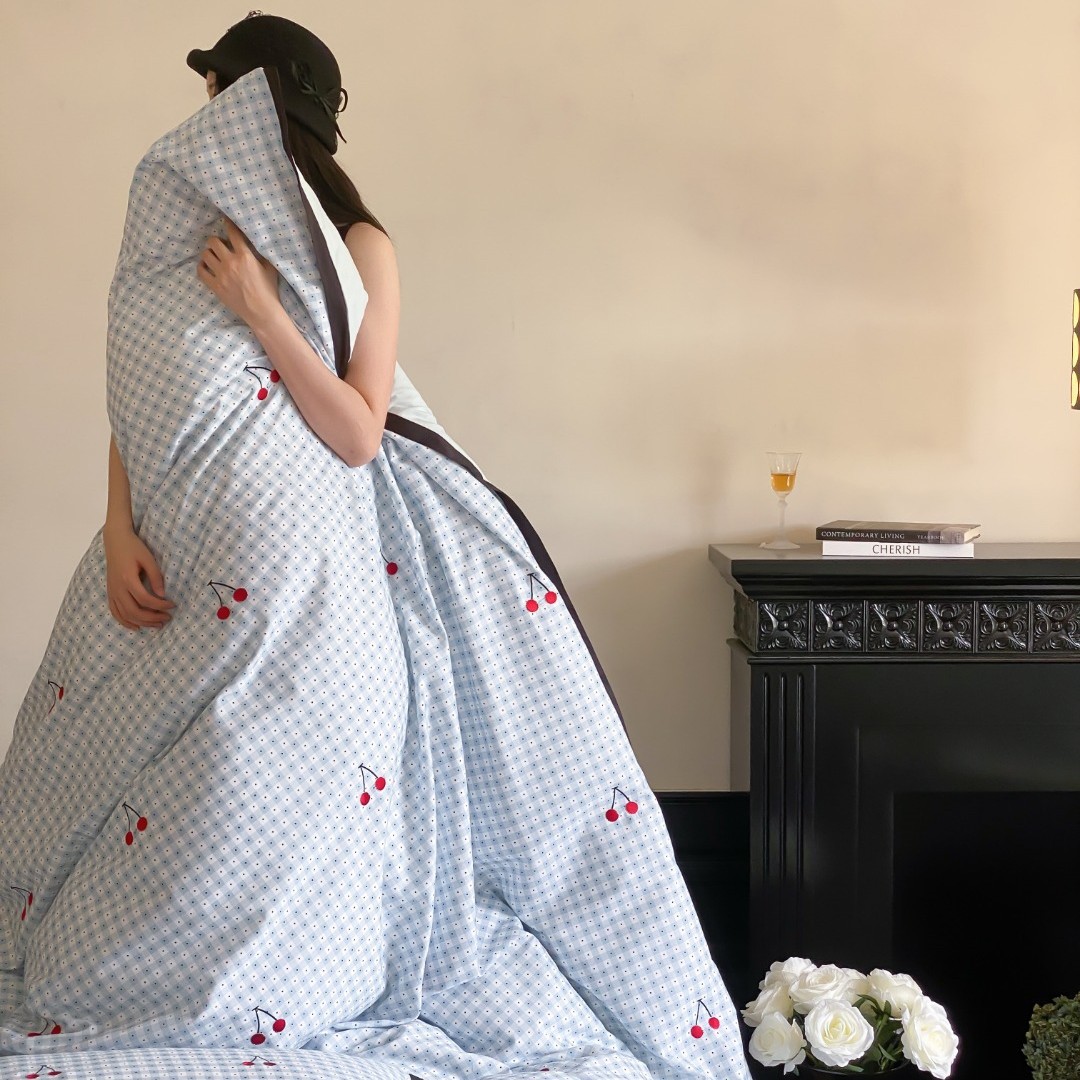 秋冬の韓国式100本の純綿の毛磨きのデジタルプリントの4つのセットの小さいさくらんぼの刺繍の保温の布団のシーツ