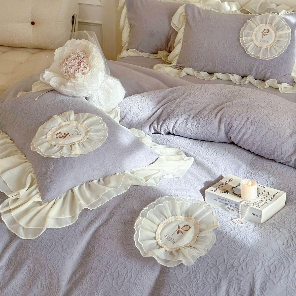 乳呼小紫花100本綿厚さ磨き保温タオル刺繍少女心秋冬ベッド用品4点セット