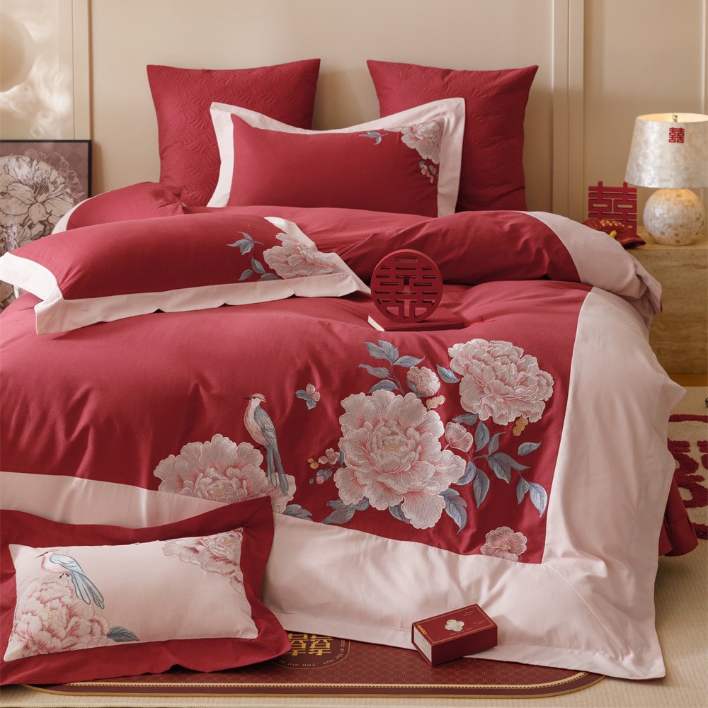 中国式結婚祝い100本棉磨毛4点セット花鳥刺繍大赤色布団カバー結婚祝いベッド用品