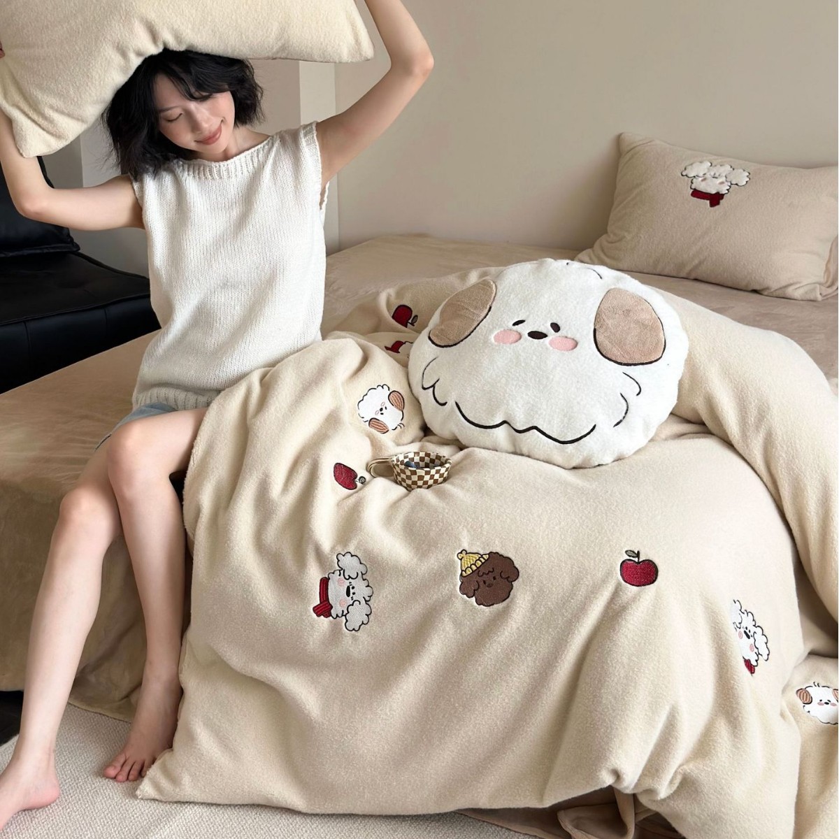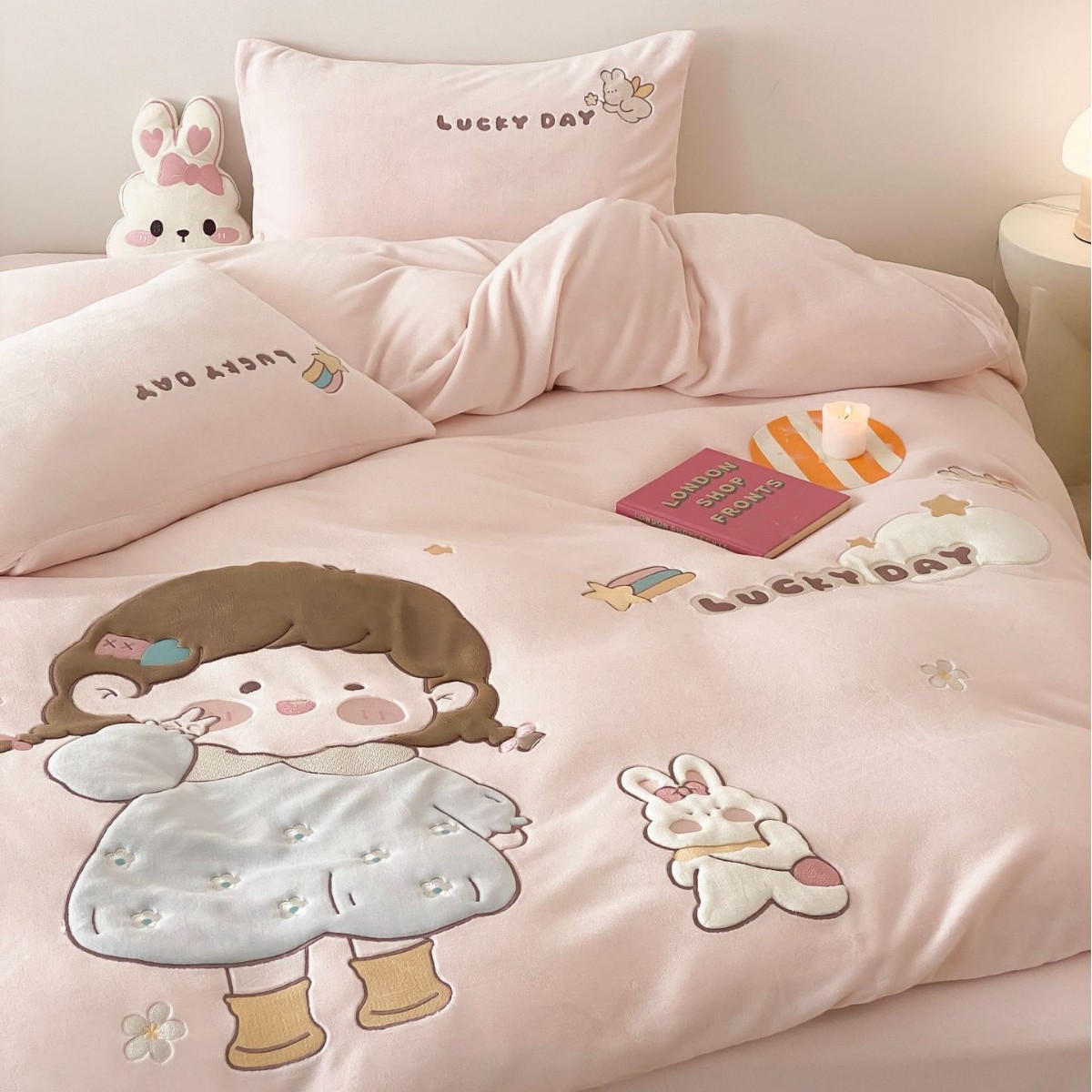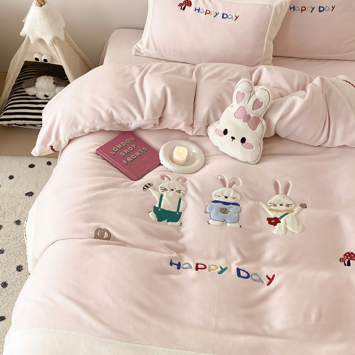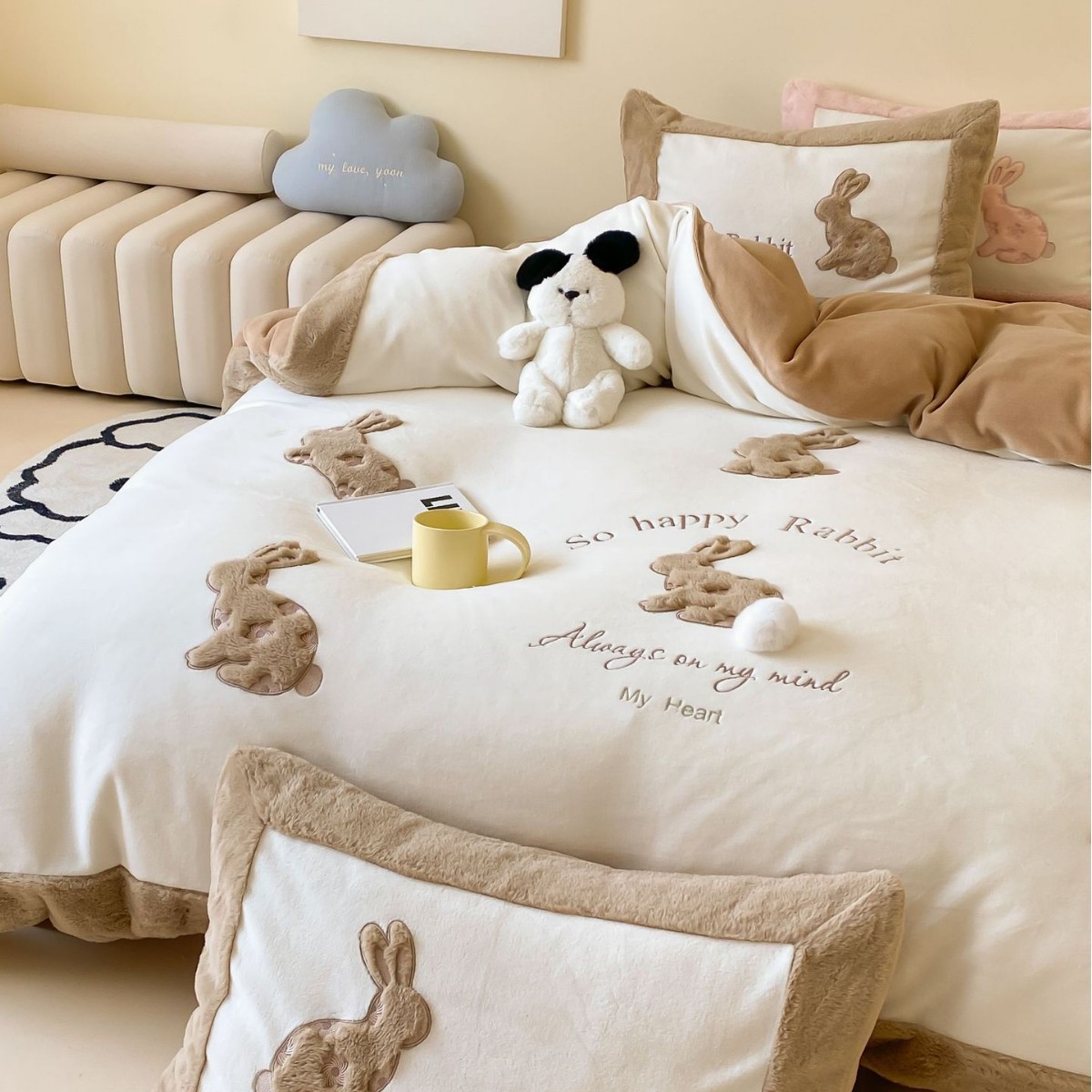 アニメかわいいビスケットウサギ超柔らかい牛乳パイル4点セット秋冬厚手布刺繍保温シーツベッド用品