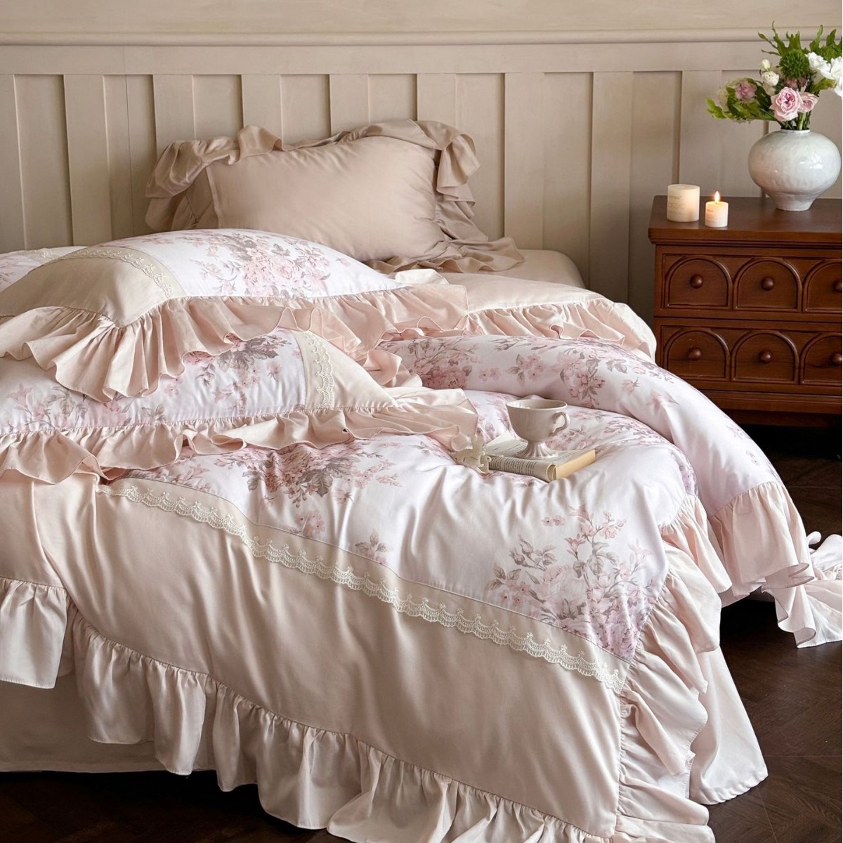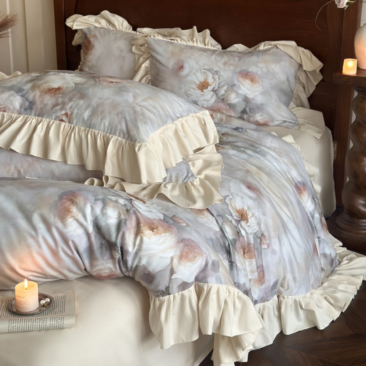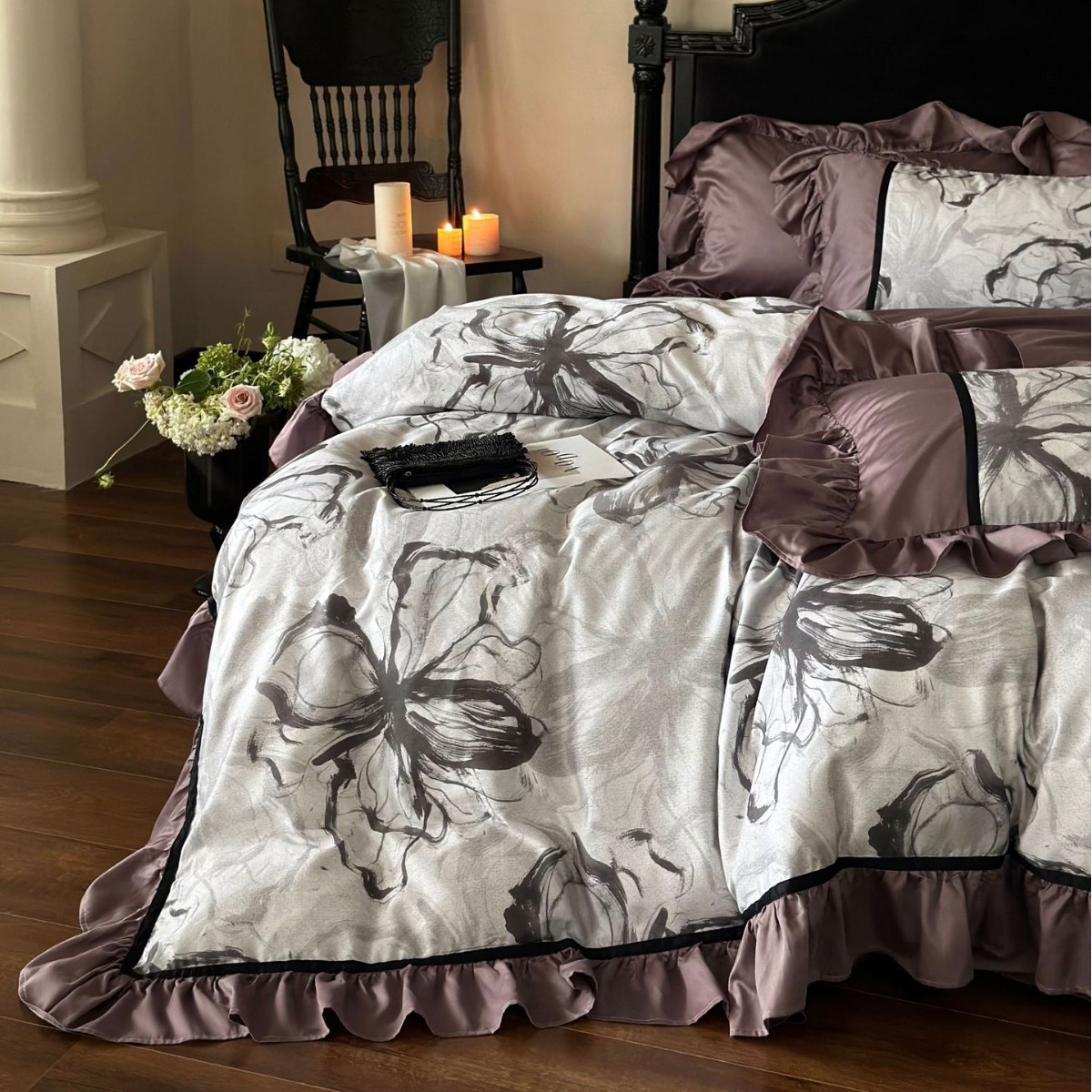 古典的な上品なシルク綿の毛磨きの4つのセットのロマンチックな花のプリントはロマンチックなしわのレースの秋冬のベッド用品をカバーします。