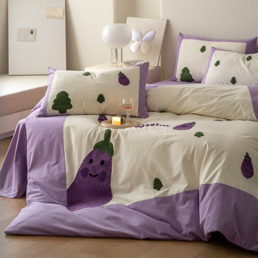 かわいい紫色のナスタオル刺繍アニメ綿の厚い磨かれた毛の4セットの綿の布団シーツのベッド用品