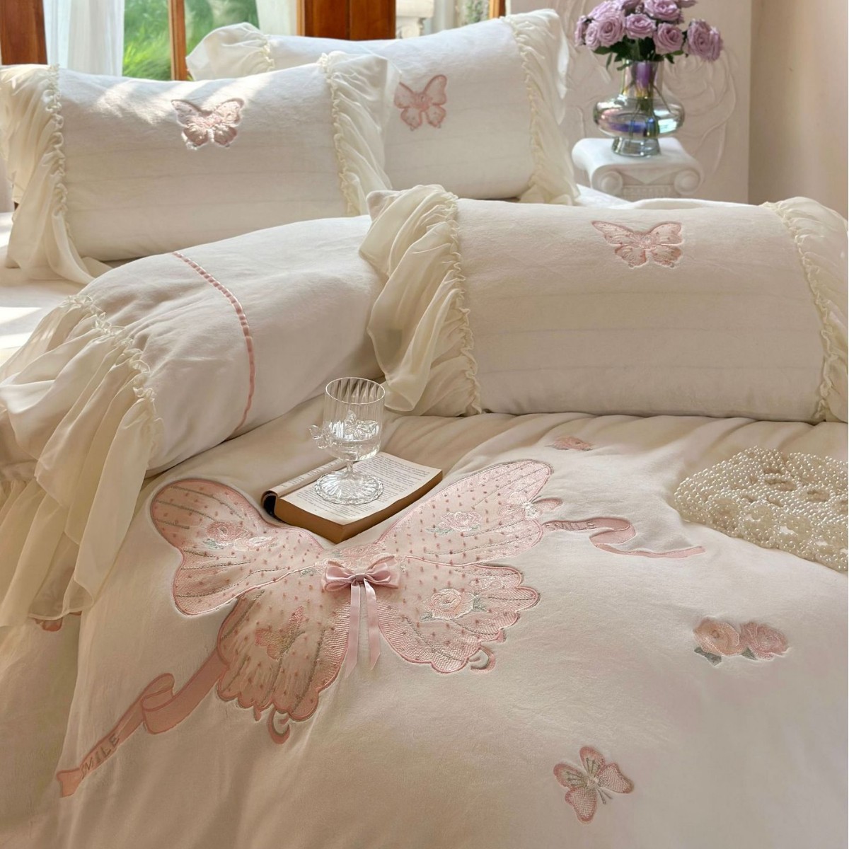 少女の心の復古の糸の4つのセットの蝶の刺繍の保温の両面の牛乳の絨毯の布団のシーツの王女の風のベッドの品