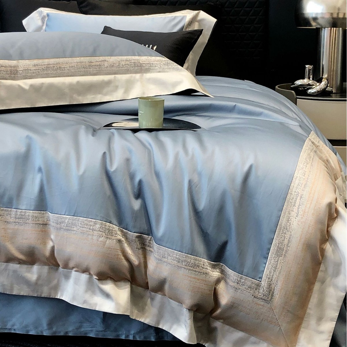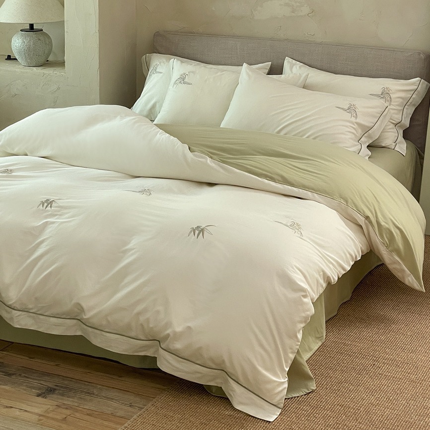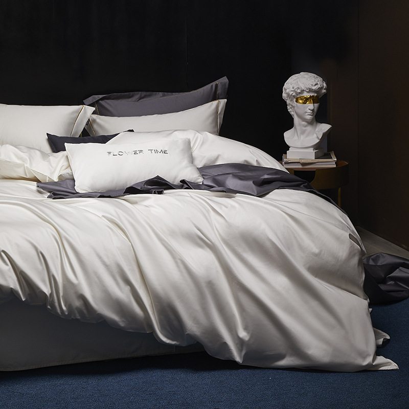 シンプルで軽い豪華な100sのベルベット綿の4セットの綿の刺繍の広い縁の布団のシーツは裸で寝ています。