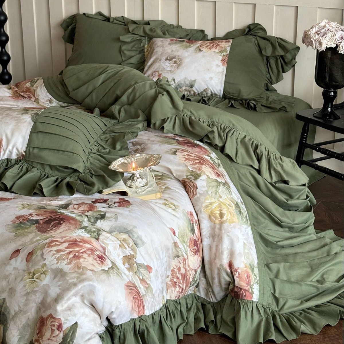 優雅な田園風のプリントのシルクの綿は毛を磨いて4セットのフランスのしわのレースのシーツの布団の寝具を洗います。