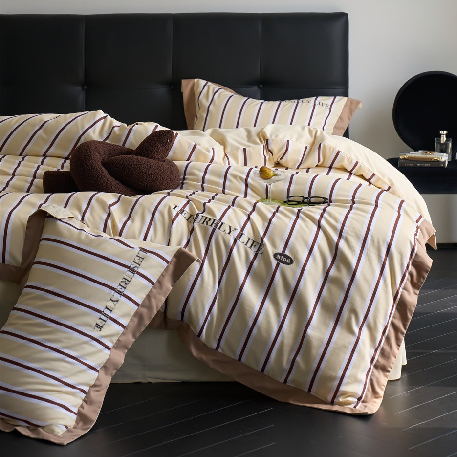 クラスAのシンプルなストライプの火山の毛磨き刺繍の4つのセットの厚い綿のシーツの布団カバーの純綿のダブルベッドの上品さ