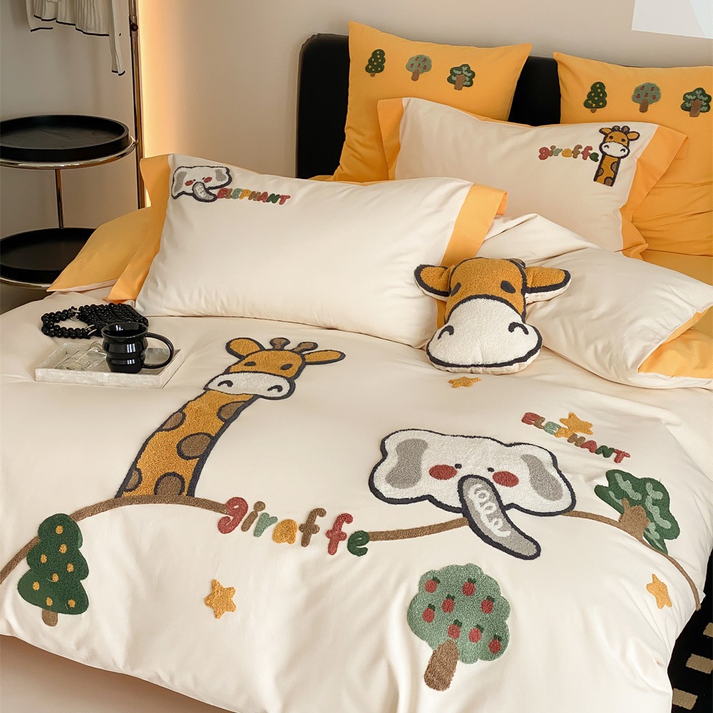 100s純綿厚手の毛磨き三四点セットのアニメタオル刺繍カバーが可愛い子供心シーツのベッド用品です。