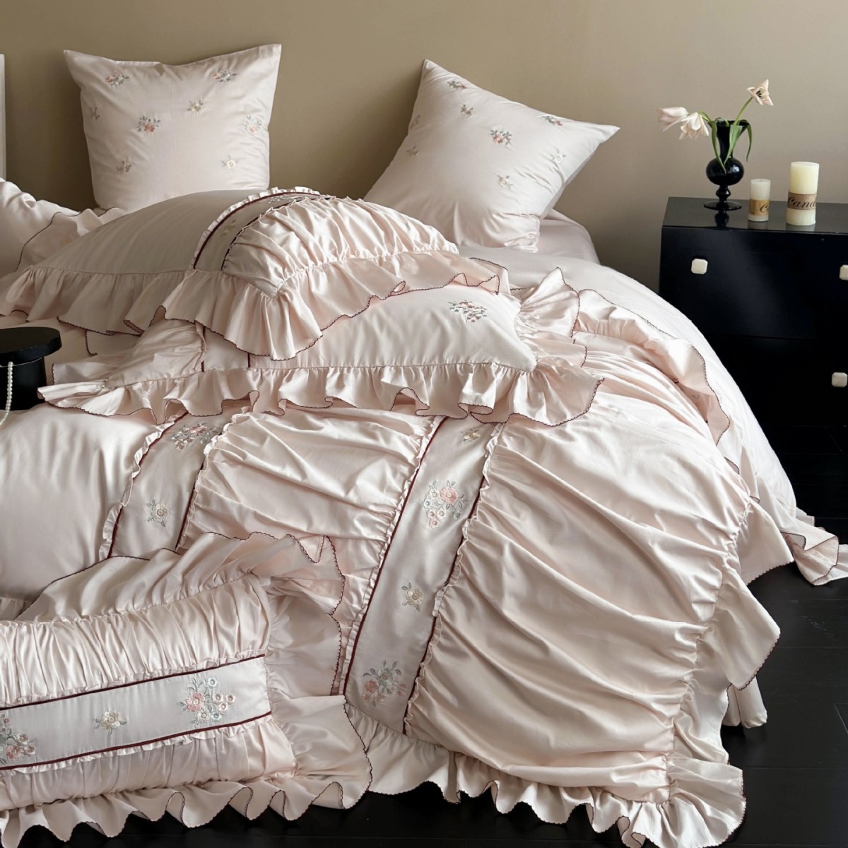 フランスの清新な少女の心の100sオーストラリアの綿の4つのセットの蓮の葉のレースの花卉の刺繍の綿の布団カバーのシーツのベッド用品
