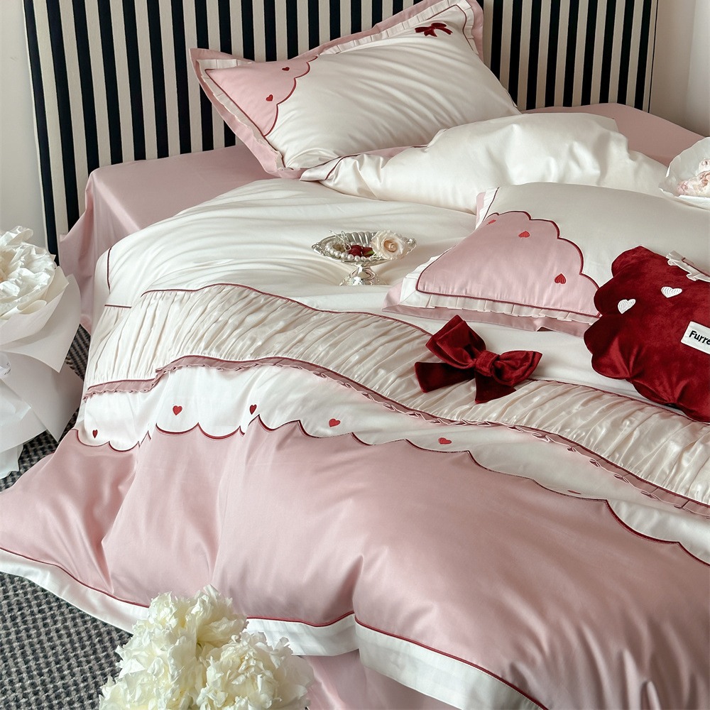 ロマンチックな少女寝室100sオーストラリア綿4点セット刺繍ピンクの布団カバー綿レース1.8mベッド用品