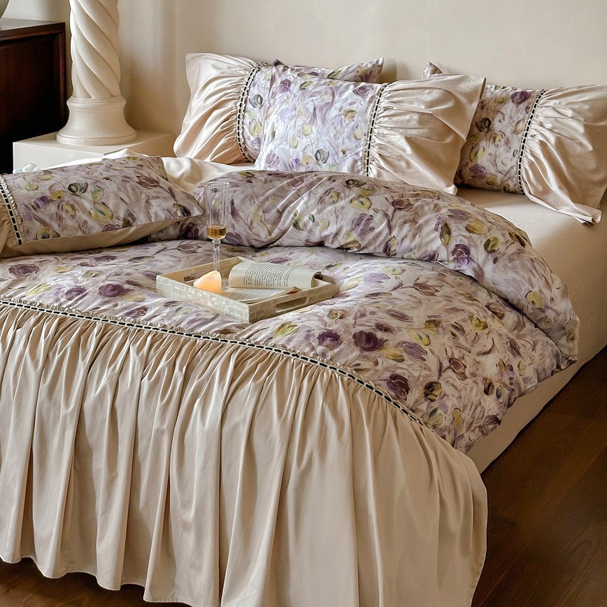 フランス風しわレース100本オーストラリア綿デジタルプリント4点セット綿功サテン高級寝室1.8mベッド用品