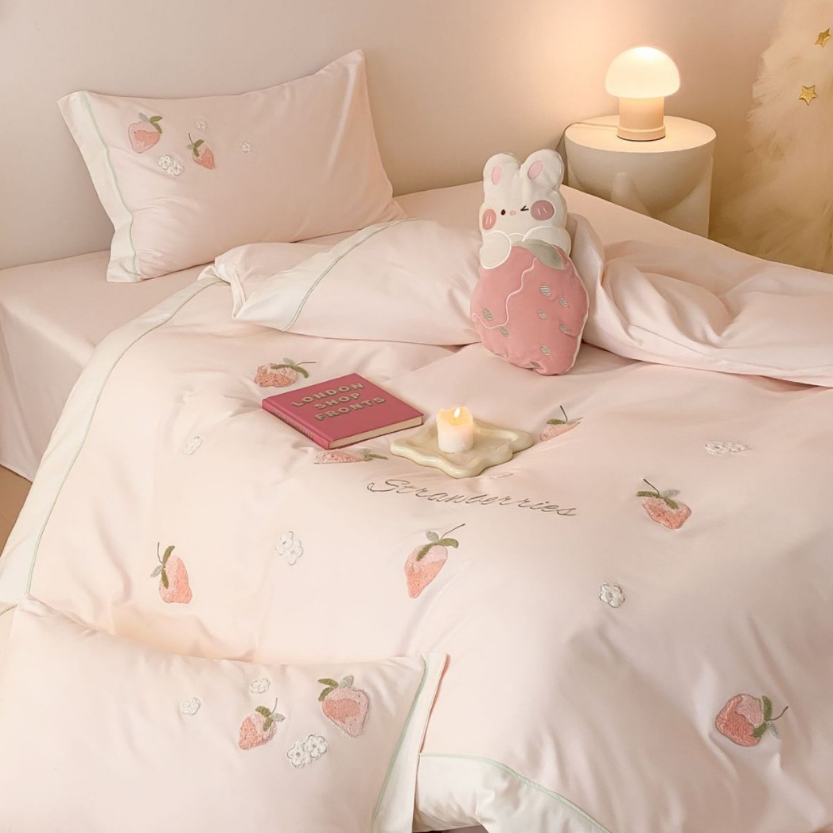 ハニー美少女いちご刺繍100本棉磨毛4点セットかわいい純綿布団カバー1.8ベッド用品