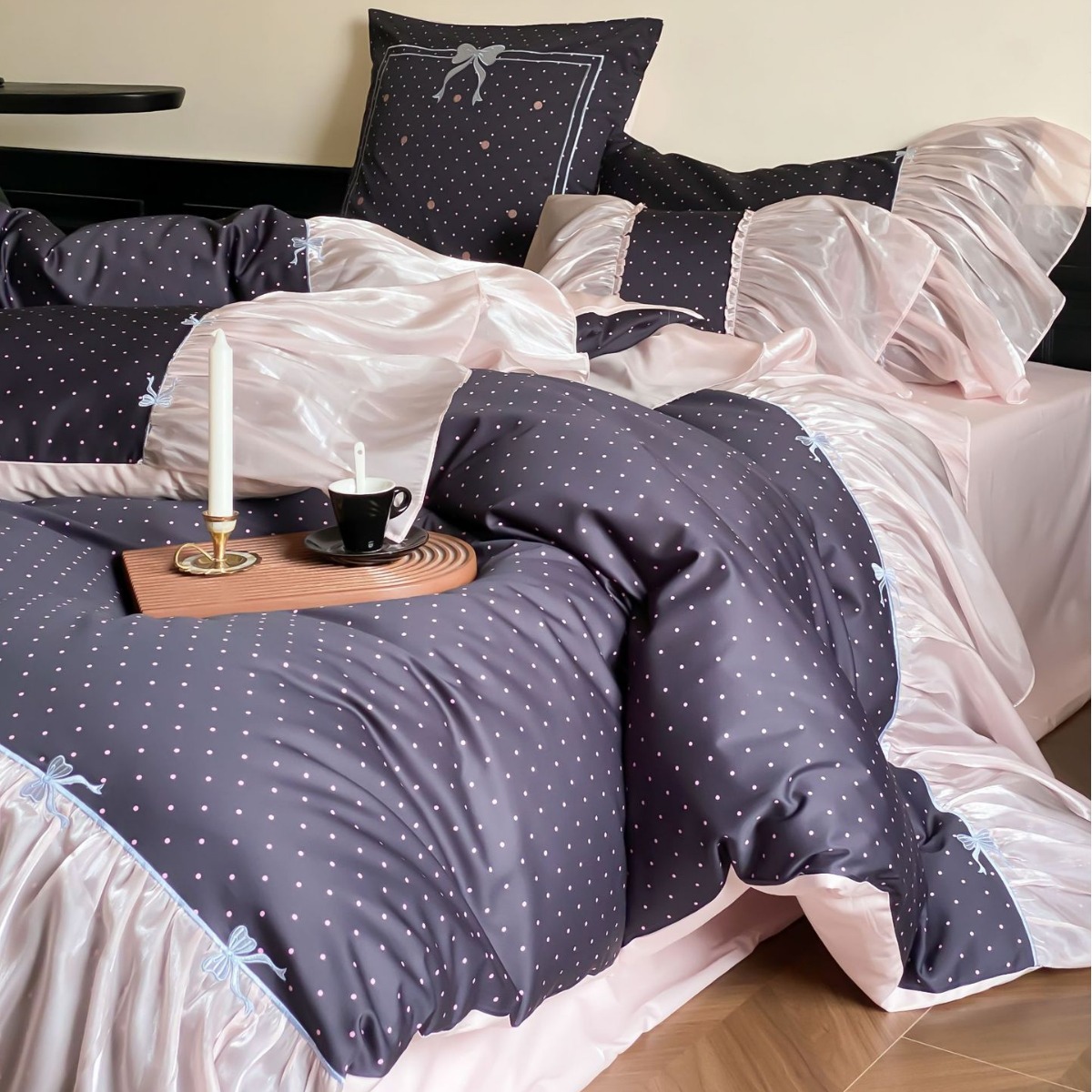 レトロなロマンチックな100本のベルベット綿の波点4点セットのフランスのハスの葉の縁には豪華な刺繍が施されている1.8mベッド用品がある