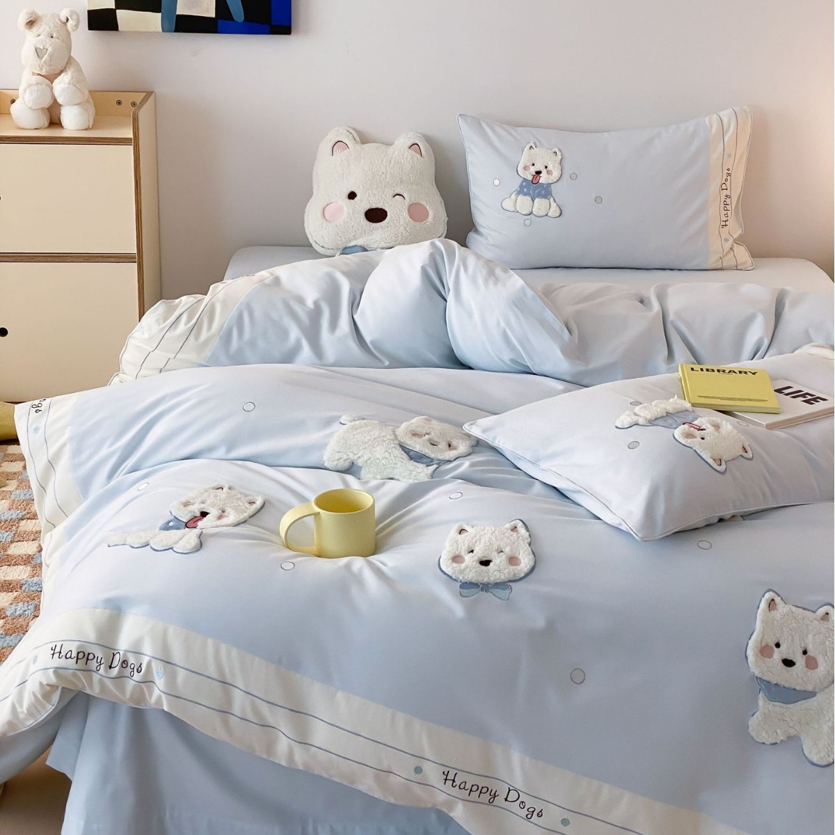 かわいい犬の刺繍入り綿起毛パッチ4点セット、漫画風の柔らかい綿製寝室用寝具