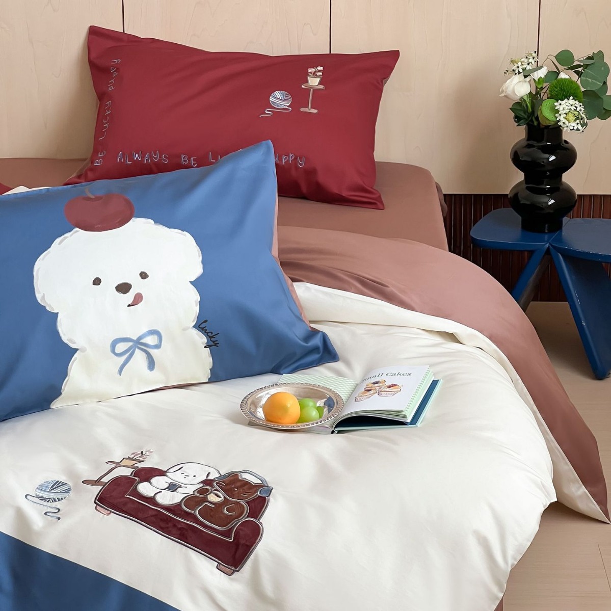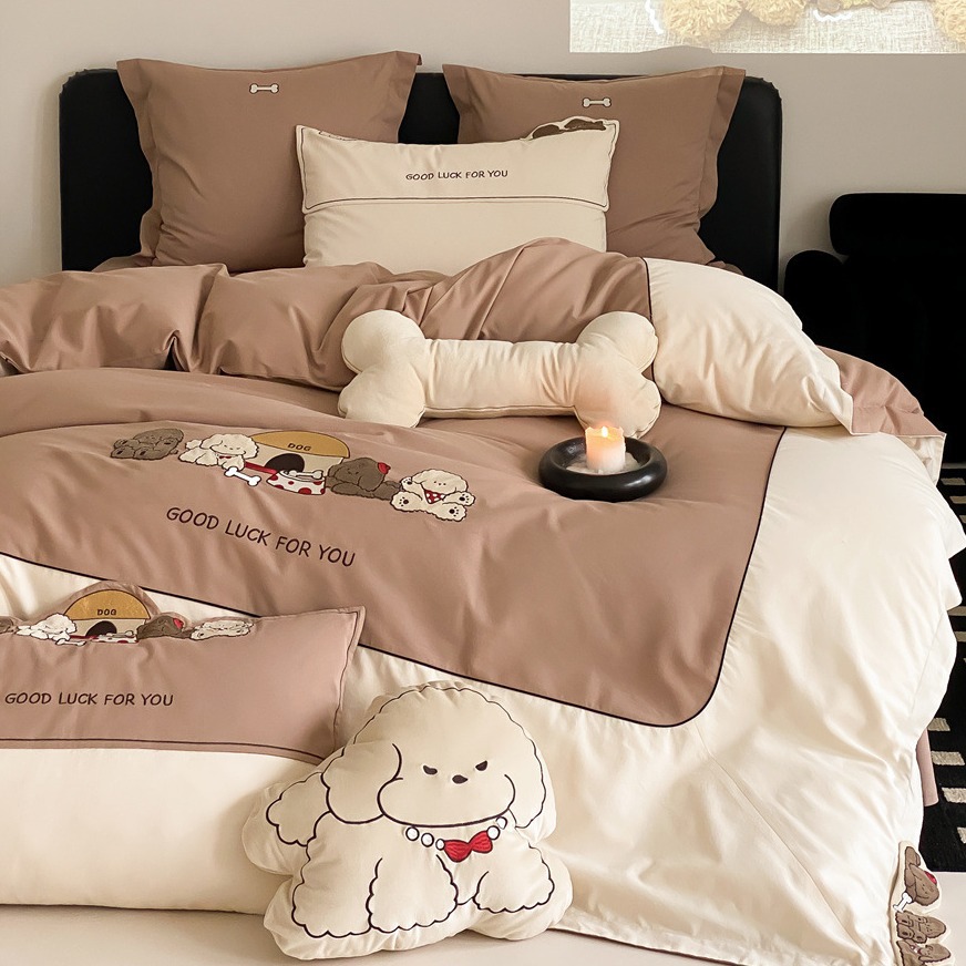 漫画の子供の子犬の布の刺繍の100sの綿の磨かれた毛の厚い4セットのかわいい綿の秋冬の寝具