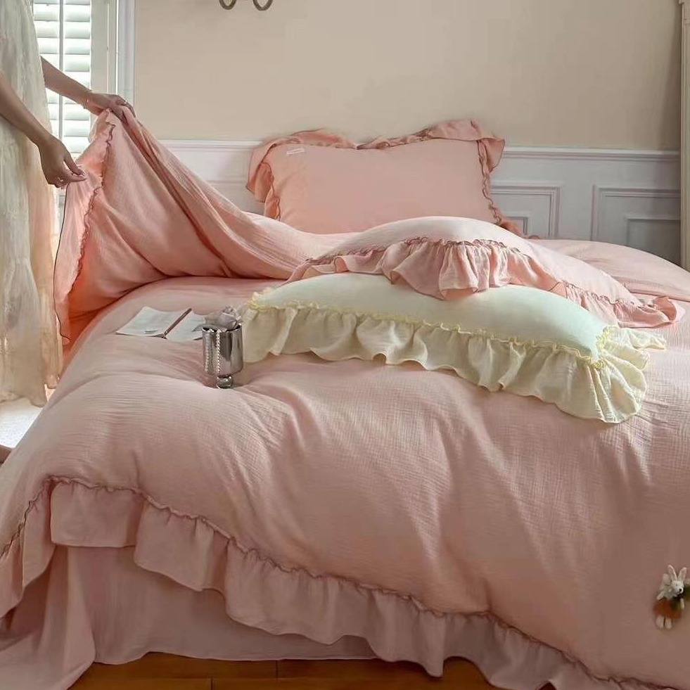 韓国式純色二重糸縮布四点セットの少女心レースの柔らかい通気性純綿布団カバー寝具