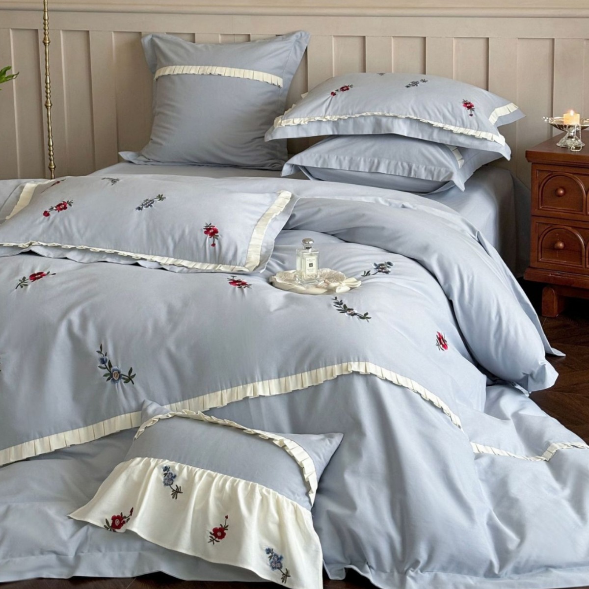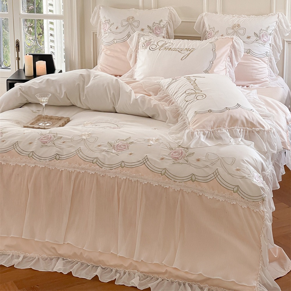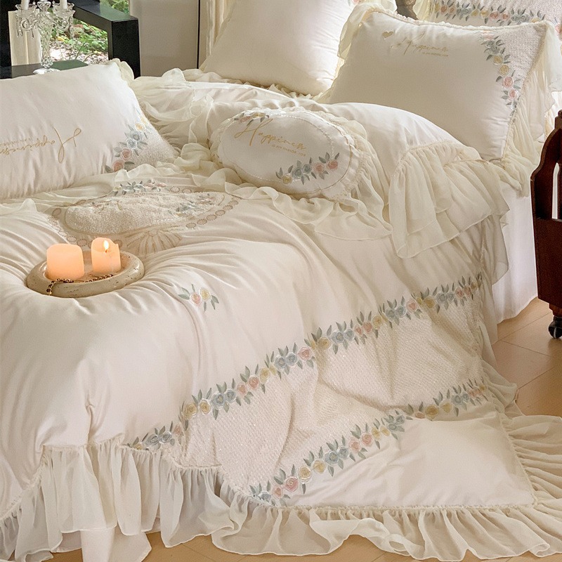 お姫様風花卉刺繍50本功サテン長パイル綿4点セットフランスレース甘い少女心布団シーツ