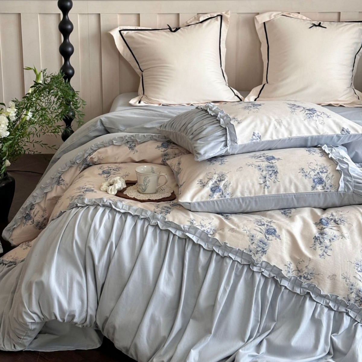 田園風花卉プリント100本のオーストラリア綿4点セットのフランス式ハスの葉の縁には美しい寝室のベッド用品がセットされています。