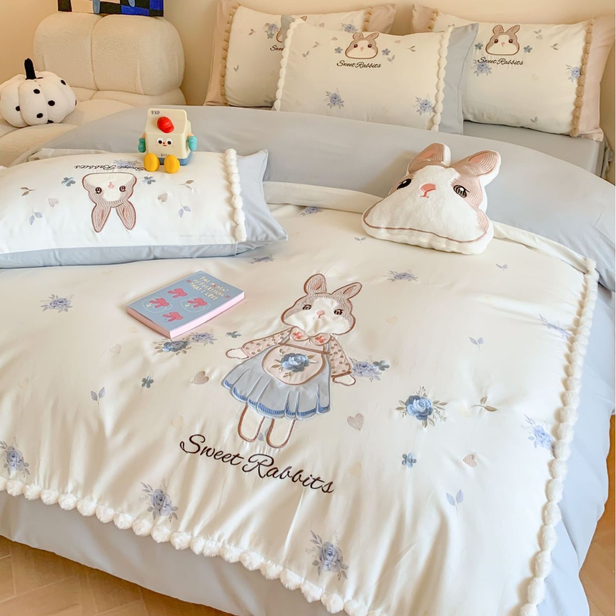 かわいいレベッカウサギのプリント120本の綿磨き4点セットの毛玉刺繍レースの布団カバーのベッド用品