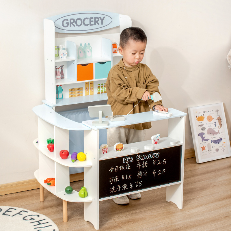 国境を越えた木製の模擬販売店の子供たちは家を渡って雑貨店のスーパーで店の知育親子玩具を販売している
