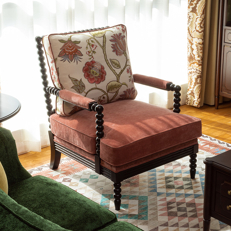 美家美式乡村复古客厅家具实木布艺老虎椅单人休闲葫芦沙发椅