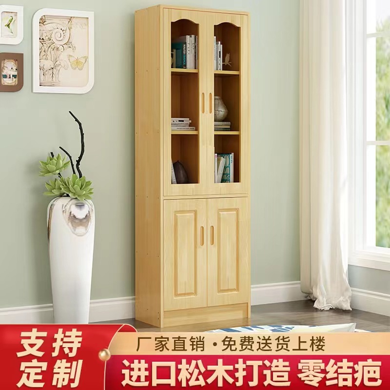 全实木书柜书架带防尘玻璃门落地一体靠墙原木多层家用收纳储物柜
