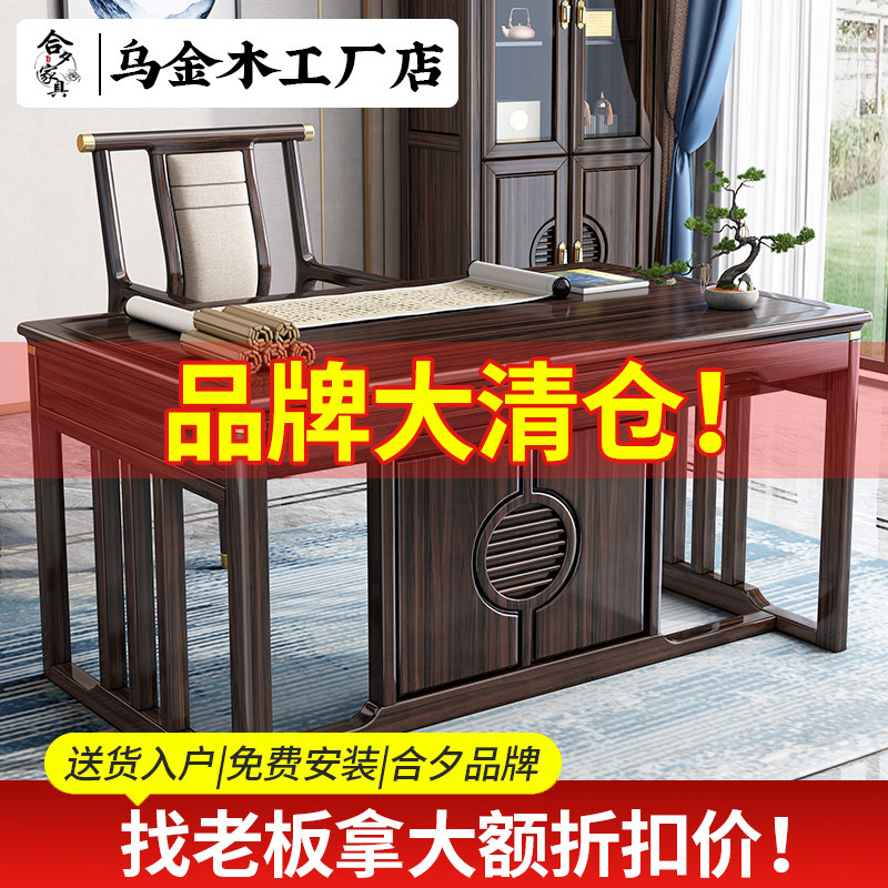 新中式乌金木全实木书房书桌电脑桌台式老板办公写字桌岩板工作台