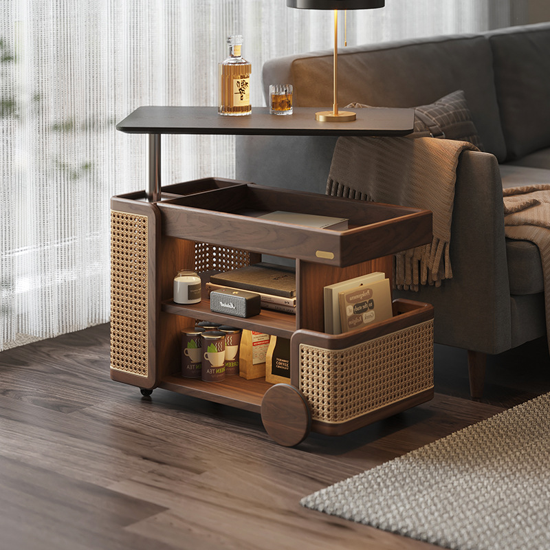 实木升降茶几可移动小推车巴士边几黑胡桃木家用旋转客厅沙发边柜