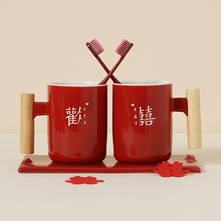 ウェディングウォッシュカップセット、新婚夫婦の歯磨きカップ、赤いセラミックマウスウォッシュ卸売メーカー