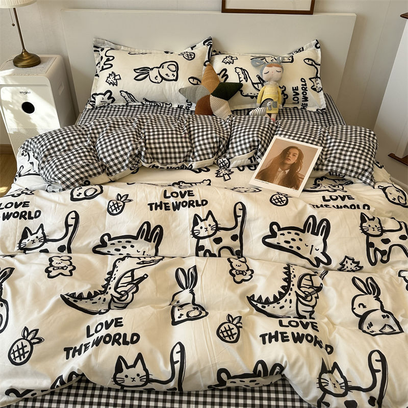 風黒白落書き漫画動物かわいい洗い綿ベッドシーツと掛け布団カバー4点セット学生寮3点セットメーカー