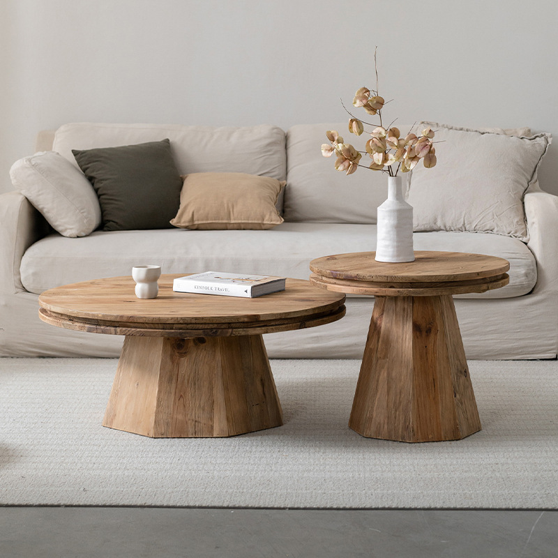 無垢材ルンジファンオールドラウンドパインウチ茶テーブルローテーブルホーム大小ラウンドテーブル組み合わせリビングルームレトロ