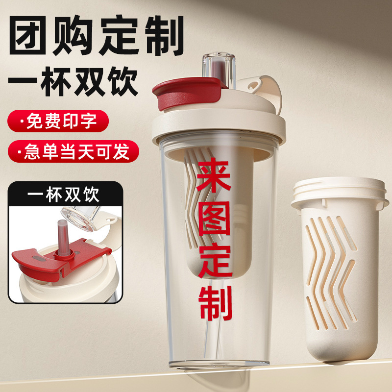ストローカップ、ウォーターカップ、女性用屋外茶水分離、高価値、漫画夏、ダブルドリンク付きプラスチックカップなし