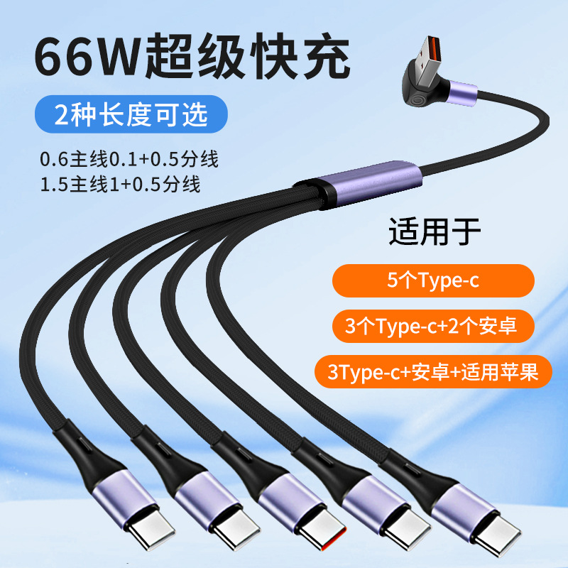 一牽引五データ線66w超急速充電五合一充電線延長1.5メートル充電宝短線0.6メートル